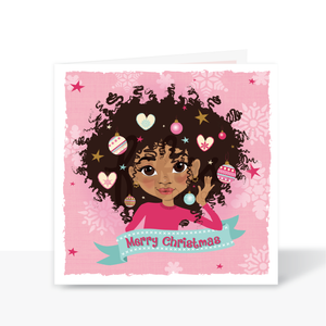 Introducing our "Merry Christmas Brown Afro Princess" greeting card from Fefus Designs – a unique and heartwarming way to share holiday cheer. This exclusive card showcases a beautiful mixed-race and brown girl with a festive afro adorned in Christmas decorations, making it an ideal choice for spreading love and celebrating the season.