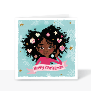 Introducing our "Merry Christmas Black Afro Princess" greeting card from Fefus Designs – a unique and heartwarming way to share holiday cheer. This exclusive card showcases a beautiful black girl with a festive afro adorned in Christmas decorations, making it an ideal choice for spreading love and celebrating the season.
