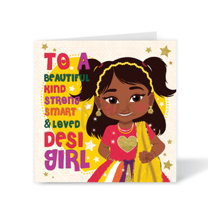 Celebrate Your Sparkle. Let your daughter know how special she is with our Celebrate Your Sparkle birthday card. Featuring a joyful South Asian girl surrounded by stars, and sparkle, this card celebrates individuality and happiness. With its bright colours and playful design, it's sure to bring a smile to her face.