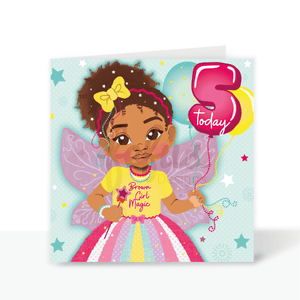 What better way to celebrate a her 5th birthday and ignite her imagination than with this super cute & colourful Brown Fairy Girl birthday card. Our cards are the perfect addition to a gift or just sent alone, for a little one who wants to see someone who looks just like themselves!