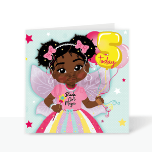 What better way to celebrate a her 5th birthday and ignite her imagination than with this super cute & colourful Black Fairy Girl birthday card. Our cards are the perfect addition to a gift or just sent alone, for a little one who wants to see someone who looks just like themselves!