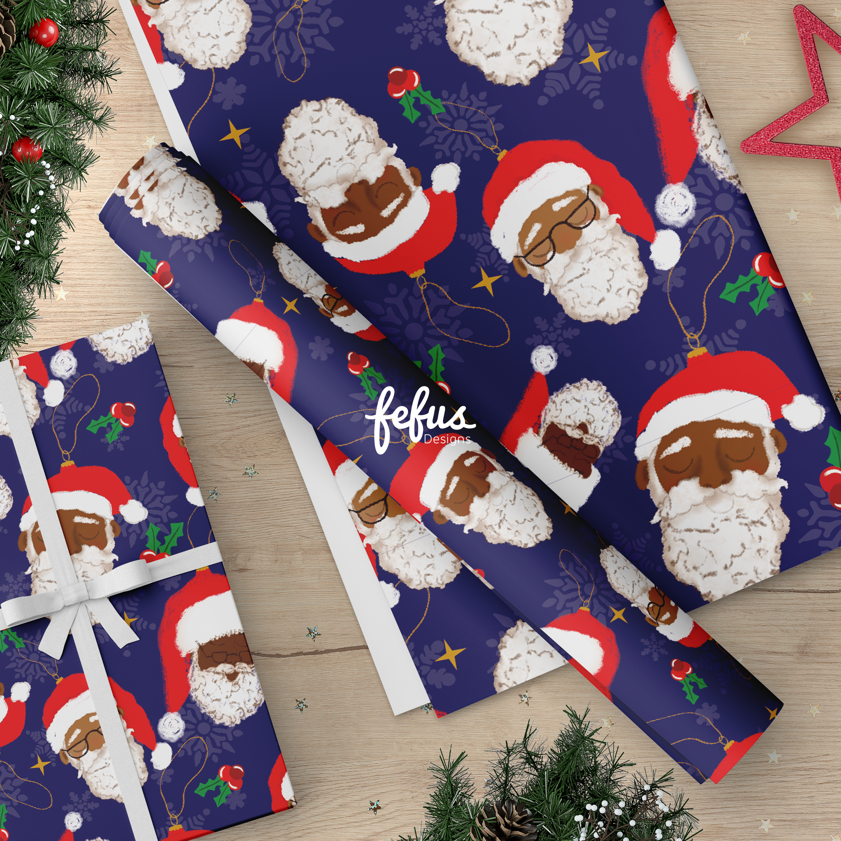 Black Santa Christmas Wrapping Paper 50cm x 70cm | Premium Xmas Gift Wrap | Fefus Designs